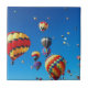Farbenfrohe schwimmende Heißluftballons, die im blauen Himmel schweben.