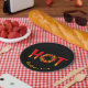 Heiß mit dem Buchstaben O aus einem Flammenkreis mit Chili-Paprikaschoten.