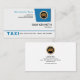 Das Design weist den Kontrast von Blau und Weiß auf. In der oberen rechten Ecke befindet sich das goldene Logo eines Taxiführers in einem blauen Trapez-Logo des Imitats. Zu seinem links, ist der Firmenname und Slogan Option. Direkt unter dem blauen Tab befinden sich Ihr Prestigename und Ihr Jobtitel. In der Nähe der Basis befindet sich eine blaue Markierung, in der alle Details untergebracht sind. Auf der Seite steht der Geschäftstyp "TAXI". Sie können dies je nach Art des Verkehrsgeschäftes, das Sie anbieten, ändern, z.B. Flughafentaxi, Limo-Service etc. Darüber hinaus finden Sie hier die Kontaktnummern.