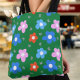 Eine stilvolle grüne Tasche mit bunten, hellen Blume in Rosa, Blues und Rot schafft einen lebhaften und fröhlichen Kontrast. Feine graue Schmetterlinge flattern anmutig um die Blume und fügen eine elegante und skurrile Touch hinzu. Ideal, um die Alltagsessenziellen mit einer Mischung aus naturlich inspirierter Schönheit und Praxisnähe zu verbinden