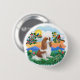 Ein Blenheim Cavalier King Charles Spaniel genießt einen schönen Tag im Land mit einem blauen Vogel auf einem blühenden Zweig auf dem links und einem Kardinal auf einem blühenden Zweig auf der rechten Seite, während die warme Sonne hoch in den Himmel klettert und flauschige Wolken vorbeischweben.