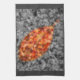 Ein selektiv gefärbtes Herbstfoto aus gefallenen crepe Myrte-Blätter mit einer goldgerahmten Blattform aus hellrot, orange und gelb vor schwarz-weißem Hintergrund.