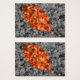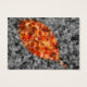 Ein selektiv gefärbtes Herbstfoto aus gefallenen crepe Myrte-Blätter mit einer goldgerahmten Blattform aus hellrot, orange und gelb vor schwarz-weißem Hintergrund.