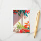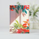 Eine lebendige und ruhige botanische Illustration mit üppigen tropischen Pflanze und rot-orangefarbenen Blätter, die in warmer Sonne baden. Die sanften Schatten und der moderne Eingangsbereich schaffen eine ruhige und sommerliche Atmosphäre. Ideal für Naturliebhaber, die ein minimales tropisches Design und eine gemütliche Wohngestaltung lieben.