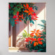 Eine lebendige und ruhige botanische Illustration mit üppigen tropischen Pflanze und rot-orangefarbenen Blätter, die in warmer Sonne baden. Die sanften Schatten und der moderne Eingangsbereich schaffen eine ruhige und sommerliche Atmosphäre. Ideal für Naturliebhaber, die ein minimales tropisches Design und eine gemütliche Wohngestaltung lieben.