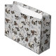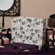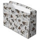 Dieser in schwarzer Tinte gezeichnet Geschenksack weist ein wunderschönes Skulpturenmuster, Rose und Spinnennetze in Creme- und Blütentönen auf, die alle auf einem eleganten, hellgrauen Hintergrund zu sehen sind.