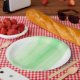 Enjoy eine Mahlzeit weg von diesem WegwerfTeller des hellgrünen Watercolor essend.