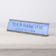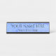 Eine personalisierte Schreibtischmarke mit Platz für Namen und Titel auf einem hellblauen bis mittelblauen Hintergrund. Es ist ein einfacher Look, der attraktiv ist. Ideal für Zuhause Office, oder beruflich, Chefs oder Mitarbeiter.