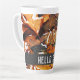 Stilvolle Latte-Tasse mit Foto von herbstfarbenen gefallenen Blätter in einer Pfütze mit "Hello Fall" benutzerdefinierbarem Textüberlagerungsformat