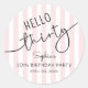 This 30th birthday party sticker showcases modern script typography reading “Hello Thirty,” complemented by a soft pink and white striped background. It's simple yet stylish design makes it a perfect feminine touch for a birthday party.