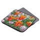 Niedliche, helle Orangentulpen im Park an einem sonnigen Tag im Garten. Das Foto wurde im Juni 2022 aufgenommen. Das Poster ist für die Innenarchitektur geeignet.