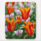 Niedliche, helle Orangentulpen im Park an einem sonnigen Tag im Garten. Das Foto wurde im Juni 2022 aufgenommen. Das Poster ist für die Innenarchitektur geeignet.