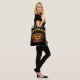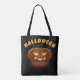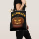Ein lebhaftes Halloween-Design mit einem leuchtenden Kürbis mit hellen Augen und Zähnen.