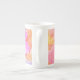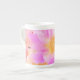Eine weiche und weibliche Knochen-China Tasse mit einem Aquarellbild von rosa und apricoten Blume.