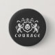 Entwerfen Sie, das zwei Löwen darstellt, die ein Löwekopfschild halten. Es gibt auch das Wort: Mut.