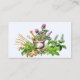 Modèle de carte de visite pour le tisanier ou le propriétaire d'une épicerie apothicaire. Couleur violet-bleu pâle avec texte jaune-vert pour customiser à trois endroits sur l'avant. Inclure les affaires en caractères gras imprimés en haut. Ajoutez un nom dans le script ci-dessous, avec plus de texte imprimé pour le contact, le site Web, les médias sociaux et / ou l'adresse. Tout le texte s'aligne à droite. Les herbes sont Ashwagandha, curcuma, et gingembre sur le devant avec plus d'herbes sur le dos.