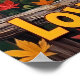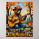 Dieses charmante Kunstwerk zeigt einen Bären, der als Feuerwehrmann verkleidet ist, mit einem Helm und einer Sonnenbrille, der eine akustische Gitarre spielt, während er auf einem rustikalen Holzzaun sitzt. Ein Glas Honig sitzt in der Nähe. Der Hintergrund zeigt farbenfrohe Herbstblätter auf den Bäumen, die auf dem Boden verstreut sind, was zu einer lebhaften Kulisse für den Herbst führt. Das Gemälde verwendet dicke, strukturierte Pinselstriche, die ein skurriles und herzzerwärmendes Gefühl verleihen, mit "Liebe My Honey", geschrieben unten.