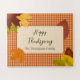Feiern Sie Erntedank, Freundschaften oder jede andere Herbstveranstaltung mit diesem rustikalen Herbstpuzzle. Dieses Puzzle mit einem Vintagen orangefarbenen Gingham-Muster, das an ein Picknick erinnert, eignet sich perfekt für alle Liebhaber von Herbstblättern. Jedes Blatt wird von Hand für das perfekte einer Touch gezeichnet. Ein tolles Geschenk für die Familie und die Kinder, sich an glückliche Zeiten gemeinsam zu erinnern. Vollständig anpassbarer Text für Ihre Veranstaltung, was auch immer er sein mag.