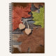 Jute-Blätter in Herbstfarben umgeben zwei kleine Holzherzen auf verwittertem Holz. Stilvolles Spiralnotebook ist ideal für Noten und Journalisierung. Das originale Foto ist mit einer ungleichen Kante versehen, um sich nahtlos mit dem dunkelbraunen Hintergrund zu verbinden.