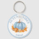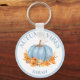 Niedlicher mädchenhafter Schlüsselanhänger mit Herbstflöten mit hellblauen Kürbis und Herbstlauben. Personalisieren Sie den Text einfach. Kate Eden Art