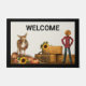 Herbst Willkommensmat mit Hirsch, Vogelscheuche, Heu, Sonnenblumen und Kürbissen.