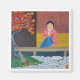 Japanerin, die im Winter ein Steppchen näht, während im Herbst Blätter aus Ahornbaum im Innenhof fallen