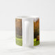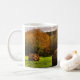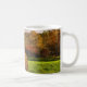 Diese Tasse der Kunstfotografie präsentiert eine schöne Herbstlandschaft in den saisonalen Herbstfarben Rot, Orange, Gelb, Braun und Grün. Ein Sturm ist vorbei und die Sonne bricht durch die Wolken auf ein Rasenfeld mit runden Heu-Ballen.