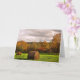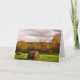 Diese leere Kundenkarte präsentiert eine schöne Herbstlandschaft in den saisonalen Herbstfarben Rot, Orange, Gelb, Braun und Grün. Ein Sturm ist vorbei und die Sonne bricht durch die Wolken auf ein Rasenfeld mit runden Heu-Ballen.