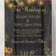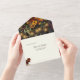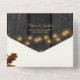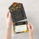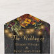 Der schöne, rostig verbrannte Orangenherbst fällt botanische Blätter, Blume und Kürbisbänder mit Streichern aus goldenen, bunten Lichtern über einem dunkelbraunen Scheunenholz und Elfenbein-Hintergrund, die eine charmante Eleganz in einer Hochzeitseinladung mit UAWG mit einem trendigen handgeschriebenen Imitat Goldtypografie-Skript. +++++++++++ Wenn Sie nicht die gedruckten Gastnamen und -adressen benötigen, löschen Sie einfach den Text auf der mittleren Rückseite. +++++++++++ Einfach mit Ihren Daten personalisieren! Geeignet für traditionelle Herbst rustikale Landhaus im Freien Hinterhof Hochzeiten.