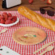 Moderne und niedliche Herbstfrüchte in einem Rahmen mit orangefarbenem Hintergrund