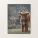 Herbstgras-Foto des Hochlandkalbs. Atemberaubendes junges Kalb von hochschottischen Rindern auf einem Herbstgrasfeld mit abgestuften Farben. Schöner, dunkelhaariger Orangenmantel kontrastiert mit hellgelb grünem Gras und Bäumen im Hintergrund. Individuell personalisierbares Monogramm mit Ihrem Namen und Ihrer Initiale auf dem verlassen.