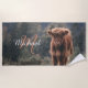 Herbstgras-Foto des Hochlandkalbs. Atemberaubendes junges Kalb von hochschottischen Rindern auf einem Herbstgrasfeld mit abgestuften Farben. Schöner, dunkelhaariger Orangenmantel kontrastiert mit hellgelb grünem Gras und Bäumen im Hintergrund. Individuell personalisierbares Monogramm mit Ihrem Namen und Ihrer Initiale auf dem verlassen.