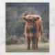 Herbstgras-Foto des Hochlandkalbs. Atemberaubendes junges Kalb von hochschottischen Rindern auf einem Herbstgrasfeld mit gedämpften Farben. Schöner, dunkelhaariger Orangenmantel kontrastiert mit hellgelb grünem Gras und Bäumen im Hintergrund.