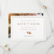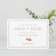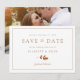 Herbst | Herbstlaube Hochzeit Foto Save the Date. Diese elegante und einfache Hochzeit bewahrt das Datum mit einem schönen Zweig von Aquarellkupfer und Rost-Blätter auf einem weißen Hintergrund mit einem bräunlichen Rand und Text. Auf der Rückseite befindet sich ein Foto für die Verlobung, das zum Personalisieren einlädt.