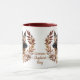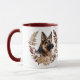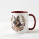 Ein hübscher Herbstkranz in den Farben Zimtbraun, Bräune und Creme umgibt das Bild eines deutschen Schäferhundes. Das Bild wird zweimal auf der Tasse gedruckt, wobei der eigene Text dazwischen liegt. Sie können den Text einfach durch Ihren Namen ersetzen, wenn Sie es vorziehen.