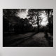 Ein warmes, schwarz-weißes Foto, das an einem sonnigen Novembernachmittag zwischen den Bäumen des Bute Park Cardiff erwischt wird. Die Herbstsonne im Himmel strahlt durch die Bäume aus, die lange Schatten und dramatische Silhouetten ausstrahlen.