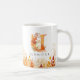 Elegante Aquarellfarben-Blätter umrahmen den Boden dieser Tasse, während der Buchstabe J eine Collage aus festlichen Fallen-Element roter und gelber Blätter ist, Personalisieren mit einem Namen, um es einzigartig zu machen.