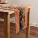 Stilvolle Herbstfarben Stoffrunner gemacht in Grafiken von bunten Herbstblättern vor einem schwarzen Hintergrund. Ein orangefarbenes, orangefarbenes Muster-Band, läuft auf beiden Seiten der schwarzen Mitte, des Läufers. Golden tan Text, in der Mitte des Läufers, liest Glück, Liebe, Danke und Familie, und kann personalisiert sein, zu lesen, was Sie gewollt haben. Schöner Tischakzent für Herbst und Erntedank.