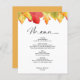 Feiern Sie Ihre Herbsthochzeit im Stil, ohne Ihr Budget mit diesem Budget Herbstlaub Wedding Menu zu beeinträchtigen. Mit charmanten Illustrationen von warmem Herbstblättern besticht dieses Menü-Design durch die gemütliche, rustikale Schönheit der Saison und bietet eine erschwingliche Möglichkeit, Ihre Empfang-Tische zu erhöhen. Die leicht zu lesende Anordnung listet jeden Gang elegant auf und fügt eine durchdachte Touch hinzu, die die Gäste durch das kulinarische Erlebnis führt. Es ist die perfekte Lösung für Paare, die einen einheitlichen, saisonalen Look schaffen wollen, ohne zu viel Geld auszugeben.