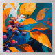 Herbstlaube und Rowan Beerenposter. Abstraktes modernes Herbstöl gemalt Kunst in blau-gelb-orange Farben.