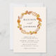Elegante und rustikale Einladungen mit einem Kranz von warmen Herbstblättern, die Ihre Namen umgeben, und Ihre Hochzeitsdetails werden unten angezeigt. Die Rückseite des Einladens weist eine kontrastfarbene, dunkelbraune Hintergrundfarbe auf.