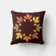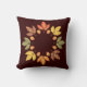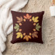 Gelbe, orangefarbene, braune und grüne Blätter aus Ahorn, die kreisförmig mit Eicheln auf tiefbraunem Hintergrund angeordnet sind.