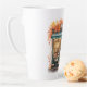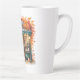 Warme herbstliche Caféfassade mit lebendigen orangen Blättern, Bücher sichtbar durch das Fenster, draußen Stühle und eine Katze sitzend am Eingang. Eine charmante saisonale Tasse für Bücherliebhaber, Lehrer, Schüler und Fans der gemütlichen Herbstlektüre-Kultur