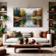 Ein ruhiger Fluss spiegelt die lebhaften Herbstfarben wider, gerahmt von goldenen Bäumen und weit entfernten Bergen. Dieses Kunstwerk bringt Harmonie, Gelassenheit und natürliche Schönheit in jeden Raum - perfekt für alle, die Ruhe und Inspiration durch Dekoration suchen.