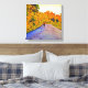 Eine Frau geht eine Straße hinunter, die von Bäumen gesäumt ist, die von Laubbäumen gesäumt sind.