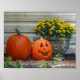 Ein Kürbis, Jack-o-Laternen und gelbe Mumm sind perfekt für ein Herbstdisplay.