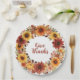 Bringen Sie die warmen Farbtöne des Herbstes an Ihren Urlaubstisch mit diesen eleganten Erntedank-Papier-Tellern! Mit einem wunderschönen Aquarellkranz aus herbstlichen Blume, Kürbissen, Gourds, Herbstlauben und Eicheln, die schön rund um den Tellerrand angeordnet sind. Ideal für Erntedank-Dinner, Ernte-Party oder saisonale Ansammlungen. Center links für Essen oder optionalen Text wie "Give Danke". Heller, moderner Aquarellstil mit lebhaften Herbstfarben für eine festliche, gemütliche Atmosphäre.