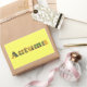Ein wunderschönes Bild der Blätter der Herbstbirke wird verwendet, um das auf Aufklebern gedruckte Wort Herbst zu buchstabieren. Kann angepasst werden.