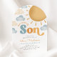 This "Here comes the son" baby shower invitation combines boho charm with a retro flair, making it an ideal choice for your sunshine-themed baby shower with yellow and blue tones. Choose the arch shape for a modern look. Celebrate in style and make your special day memorable with this delightful invitation.