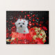 Das ist mein niedlicher kleiner maltesischer Welpen-Hund Hermes. Er sitzt in einer großen Geschenkboxen mit einer Dusche von roten Herzen !